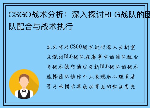 CSGO战术分析:深入探讨BLG战队的团队配合与战术执行
