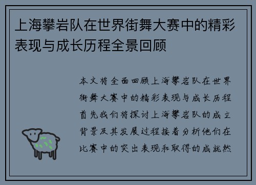 上海攀岩队在世界街舞大赛中的精彩表现与成长历程全景回顾