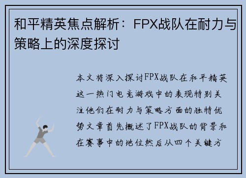 和平精英焦点解析:FPX战队在耐力与策略上的深度探讨