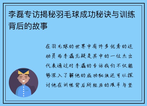 李磊专访揭秘羽毛球成功秘诀与训练背后的故事