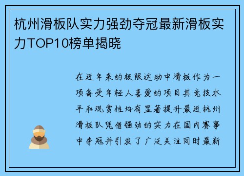 杭州滑板队实力强劲夺冠最新滑板实力TOP10榜单揭晓