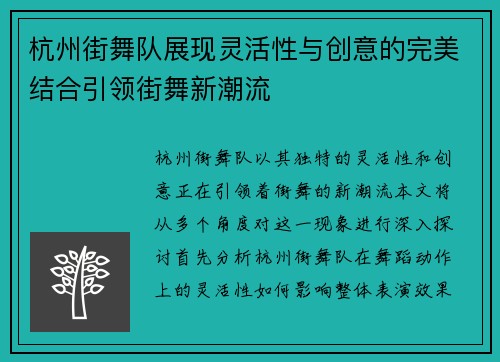 杭州街舞队展现灵活性与创意的完美结合引领街舞新潮流