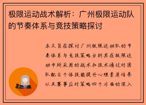 极限运动战术解析:广州极限运动队的节奏体系与竞技策略探讨